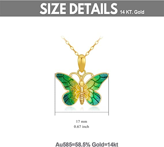 ?【DESIGN AND QUALITY】This beautiful 14K women gold butterfly Pendant Necklace is made of the finest metal and has a high degree of polish. The stylish and elegant design of this necklace is absolutely impeccable.Metal: 58.5% pure gold (in 14k real gold, not just a covering). These 14k necklace for women girls are high-quality and Nickel Free.